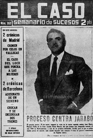 Hubo una vez un adinerado galán, frecuentador de la noche madrileña, que allá por 1957 escondía un macabro secreto. Confiaba tanto en su posición que cometió un grave error. Una mañana de verano cogió su traje, todo cubierto de sangre de las víctimas que acababa de asesinar a sangre fría, y lo llevó a una tintorería de la Calle Orense. Allí no se creyeron que semejante sangría procediera de una trifulca, como nuestro protagonista les dijo. Les faltó tiempo para llamar a la policía. Seguro que ya sabéis que os estamos hablando de Jarabo, quien pasaría a mejor vida sentado en el garrote vil. Eso sí; un hombre de su nivel social no podía hacerlo sino vestido de manera elegante y oliendo a colonia cara. ¡Qué chulería!