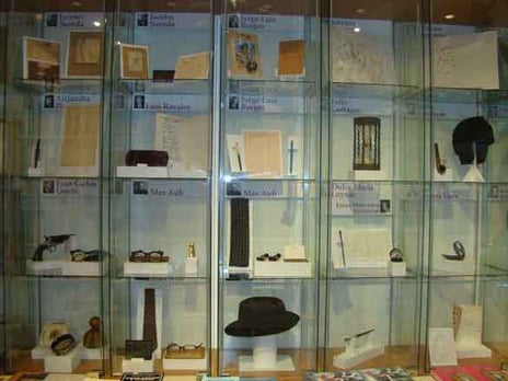 Cartas y otros objetos personales de Onetti, pipas de Ramón Gómez de la Serna y de Julio Cortázar, la dedicatoria que Mario Benedetti escribe a mano a su amigo Juan (Onetti), el esbozo de un poema que anota en la hoja de un hotel o las gafas que olvidó en un restaurante madrileño.